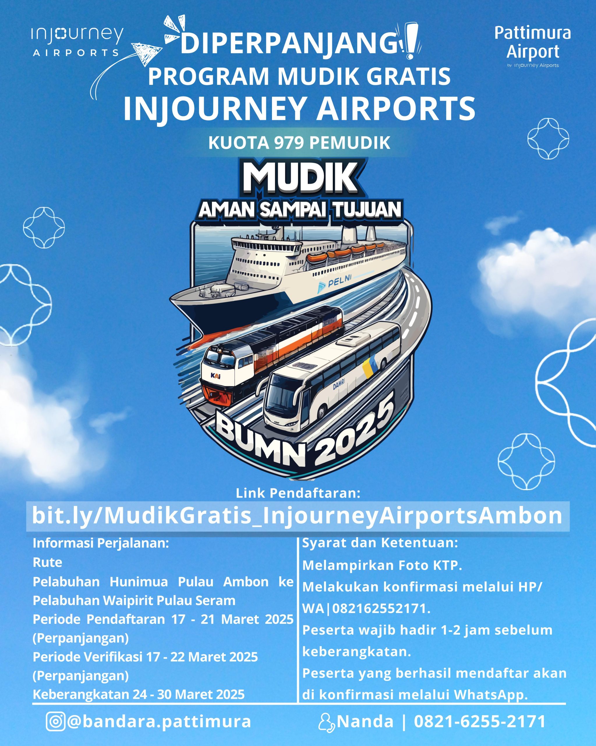 Sehubungan dengan ketersediaan kuota yang masih banyak, oleh sebab itu PT Angkasa Pura Indonesia Bandara Pattimura Ambon memperpanjang periode pendaftaran dan periode verifikasi Program Mudik Gratis 2025 ini yaitu Periode pendaftaran sampai dengan tanggal 21 Maret 2025. Program ini mudik gratis yang dilaksanakan secara serentak di seluruh Indonesia dan diperuntukkan bagi seluruh masyarakat yang akan mudik menggunakan moda transportasi kapal ferry dari Pelabuhan Hunimua Ambon menuju Pelabuhan Waipirit Pulau Seram. Kuota peserta Mudik Gratis ini adalah sebanyak 979 orang, dan hanya memerlukan KTP dan mengisi formulir online pada link: https://bit.ly/MudikGratis_InjourneyAirportsAmbon.