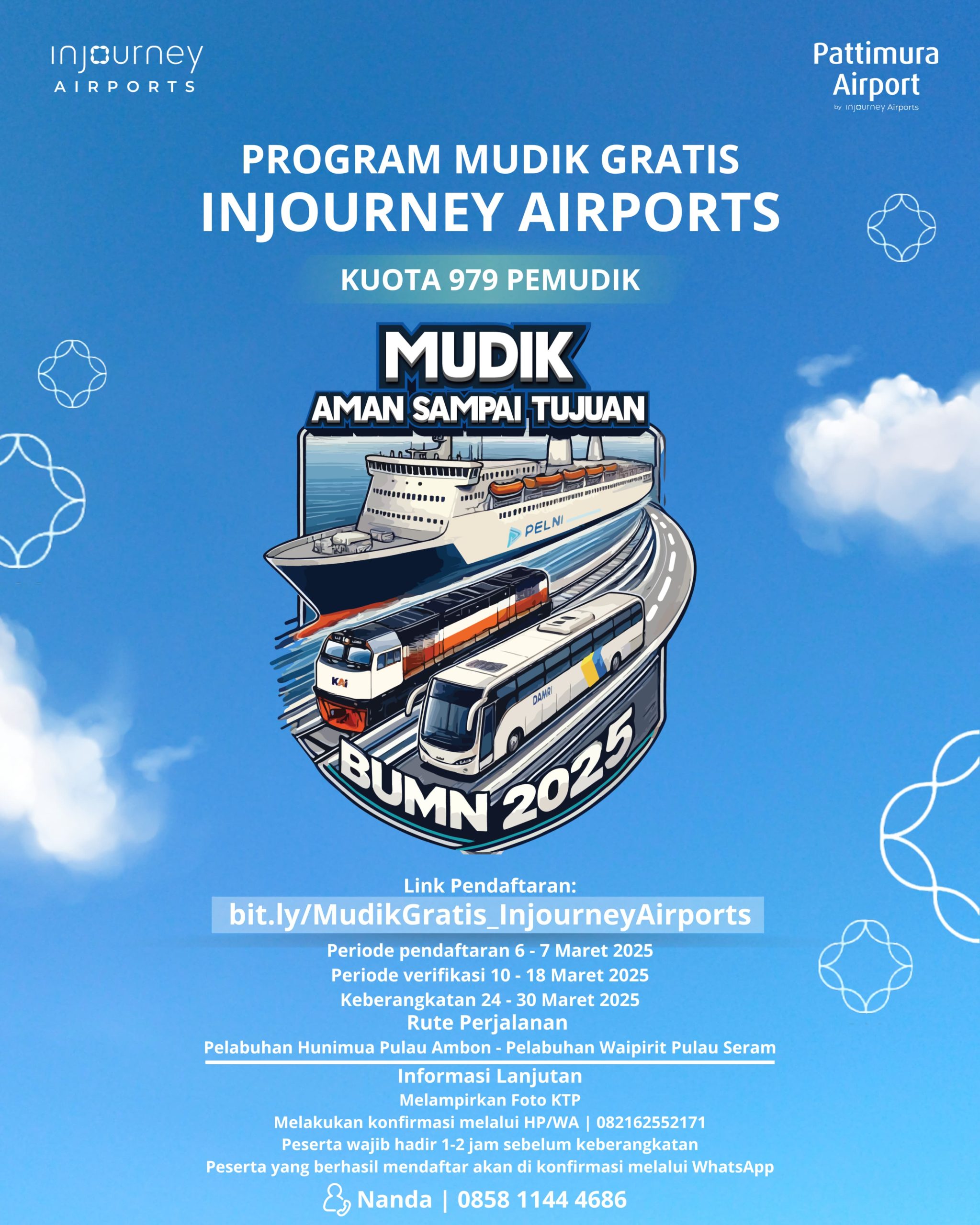 Mudik Gratis Bersama Injourney Airports ini dilaksanakan serentak di seluruh Indonesia untuk seluruh masyarakat yang membutuhkan, terutama untuk pemudik dengan ekonomi menengah ke bawah. Sebagai bentuk komitmen PT Angkasa Pura Indonesia Bandara Pattimura Ambon dalam memberikan kontribusi positif terhadap masyarakat provinsi Maluku khususnya kota Ambon, program ini dilaksanakan di wilayah provinsi Maluku dengan menyediakan moda transportasi kapal ferry dari Pelabuhan Hunimua Ambon menuju Pelabuhan Waipirit Pulau Seram dengan kuota sebanyak 979 (sembilan ratus tujuh puluh sembilan) orang.