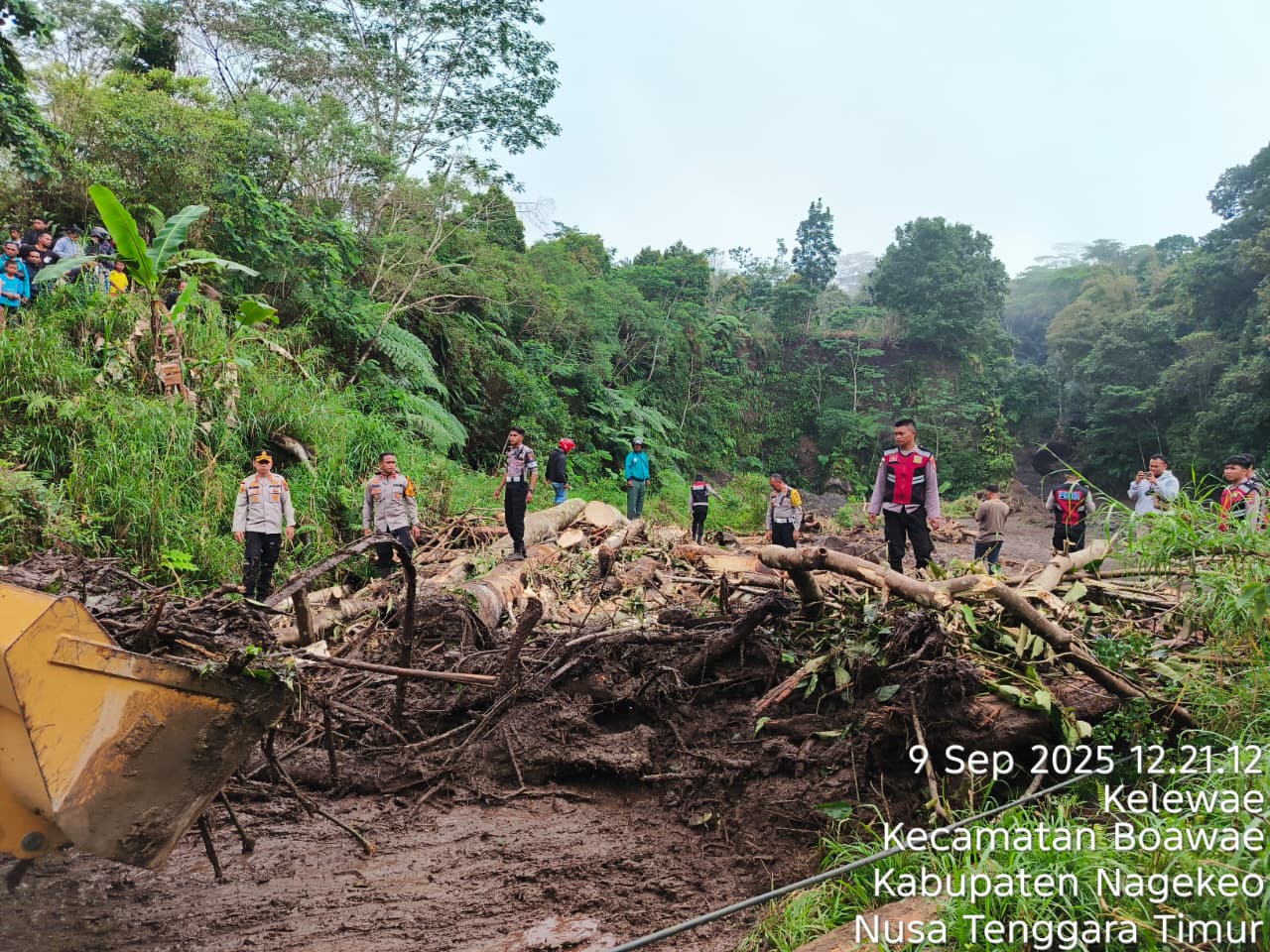 beritasumbernews.com – Memasuki hari ketiga pasca bencana banjir bandang yang melanda Kecamatan Mauponggo, Polres Nagekeo di bawah pimpinan AKBP Rachmat Muchamad Salihi, S.I.K., M.H., terus memperkuat sinergi dengan berbagai pihak dalam penanganan darurat bencana. Pada Kamis (11/9/2025) pukul 10.00 WITA, tim gabungan yang terdiri dari warga, personel TNI Batalyon TP 834 WM, dan unsur terkait berhasil menemukan jenazah seorang anak di belakang Kantor Desa Sawu. Jenazah tersebut telah teridentifikasi sebagai Archiles Agustinus Busa Jago (1,2 tahun) dari Desa Sawu dan telah diserahkan secara resmi kepada keluarga untuk dimakamkan.