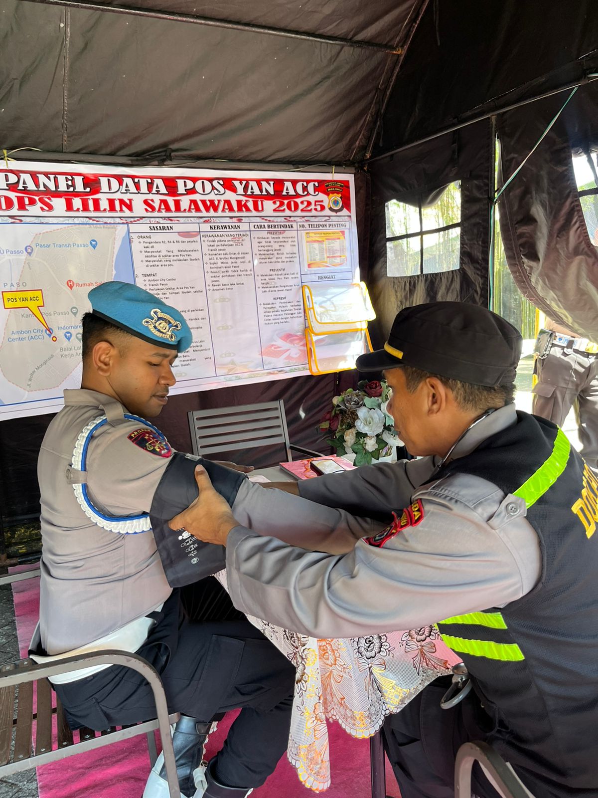 Dalam kegiatan tersebut, tim medis Satgas BanOps Biddokkes Polda Maluku melakukan pemeriksaan tekanan darah, pemantauan kondisi kesehatan personel, serta pemberian vitamin dan obat-obatan sebagai langkah preventif menjaga stamina dan kebugaran selama menjalankan tugas pengamanan.
