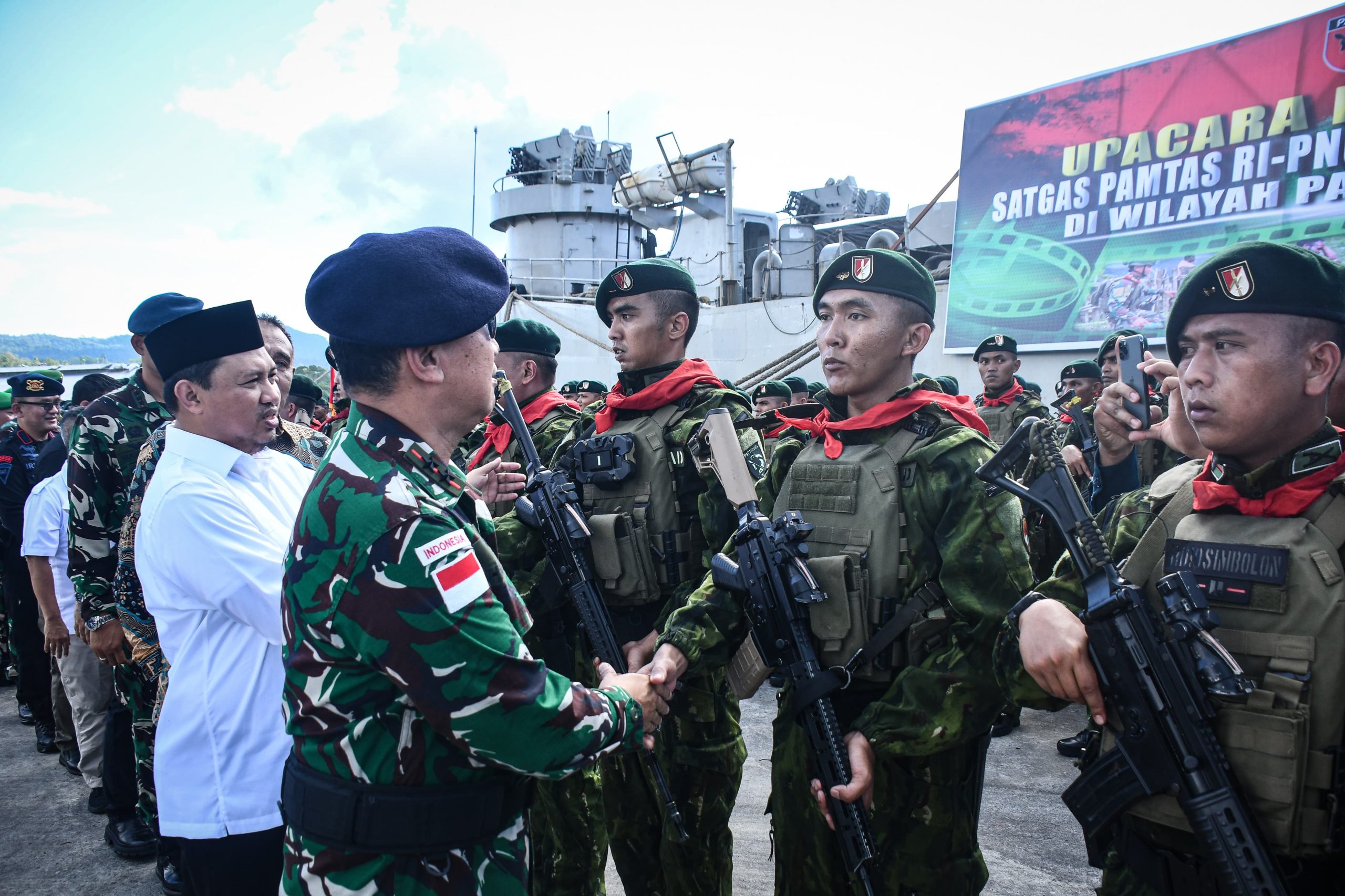 Pangdam XV/Pattimura, Mayjen TNI Putranto Gatot Sri Handoyo memimpin jalannya Upacara Penyambutan Purna Tugas Satgas Pamtas RI-PNG Mobile Yonif 732/Banau tersebut.