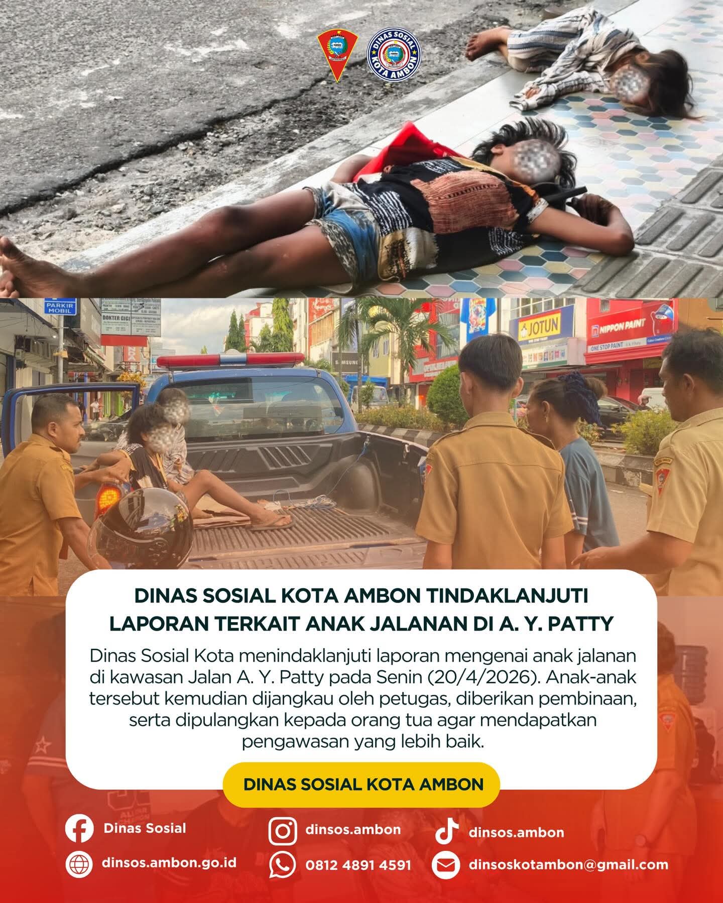 Ambon – beritasumbernews.com – Dinas Sosial Kota Ambon menindaklanjuti keberadaan anak jalanan yang ditemukan tidur di emperan jalan kawasan AY Patty, Senin (20/4/2026).